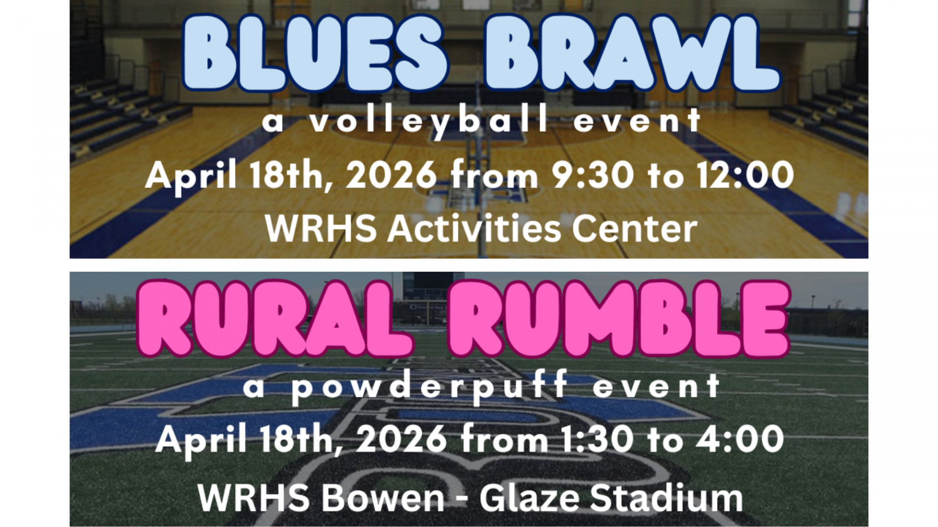 Come out and support our students during a full day of friendly competition hosted by the Washburn Rural High School Student Council: Blues Brawl Volleyball 9:30 AM – 12:00 PM WRHS Activities C...